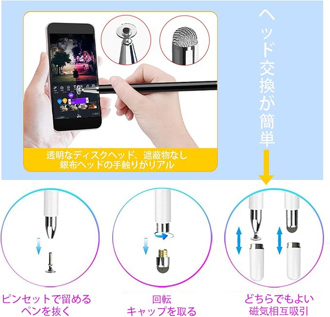【通用性が高い】両端のペン先が付いています。ディスク型のペン先は高感度で、簡単なスケジュールの記録とサインに適しています。ディスクの形状により、画面を傷つけにくいです。導電繊維製のペン先は柔らかく、画面上を自由にスライドできます。 タッピングゲームや閲覧をするときに最適です。ご注意:使用時には、使用規範に従い、過度な力を加えず、極端に凹凸のある表面での使用を避け、ねじ山の損傷やタッチ反応の不良を減らすようにしてください。