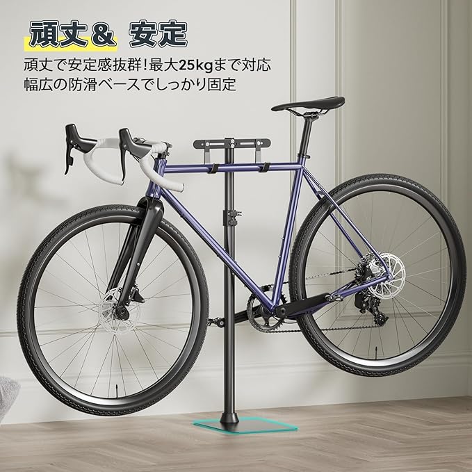 【✅ 最大25kgまで対応!幅広い自転車に最適】最大25kgの耐荷重設計。頑丈な支柱と広いベースが、さまざまな種類の自転車をしっかり支えます。ロードバイク、マウンテンバイク、折りたたみ自転車、クロスバイクなど、幅広い車種に対応可能。自宅やガレージでの収納・整備に最適な一台です。