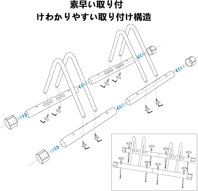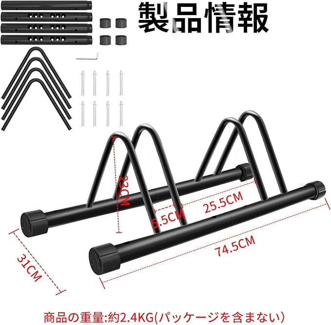 【梱包内容】自転車スタンド 2、アンカーボルト 8【サイズ】幅75cm 奥行31cm 高さ23cm 車輪幅5.5cm( こども 幼児車や原付/その他一部のタイヤに合わない場合がありますのでご了承ください。)従来の一段式サイクルラックとは異なり、2台の自転車を同時に収納できる。、便利性が一気にアップします。