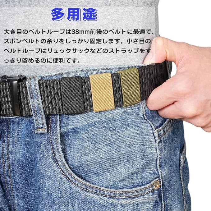 【多用途】:大き目のベルトループは38mm前後のベルトに最適で、ズボンベルトの余りをしっかり固定します。小さ目のベルトループはリュックサックなどのストラップをすっきり留めるのに便利です。