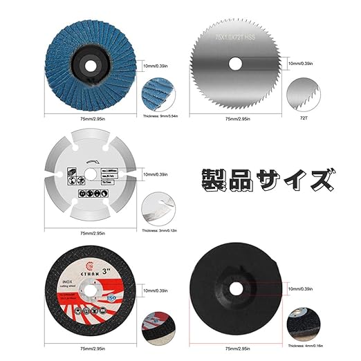 直径75mmのブレード5枚が含まれており、様々な用途に対応します。