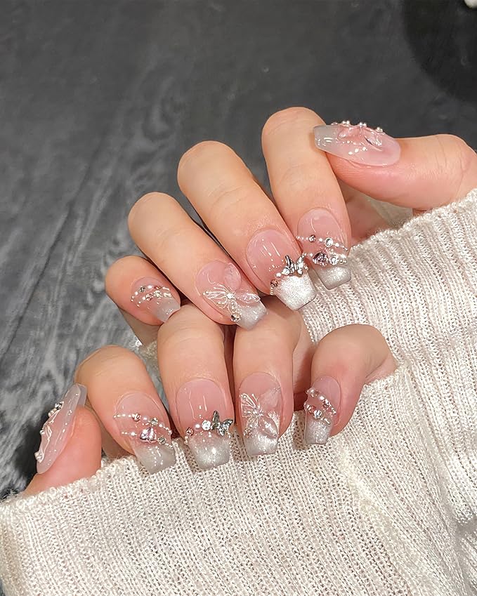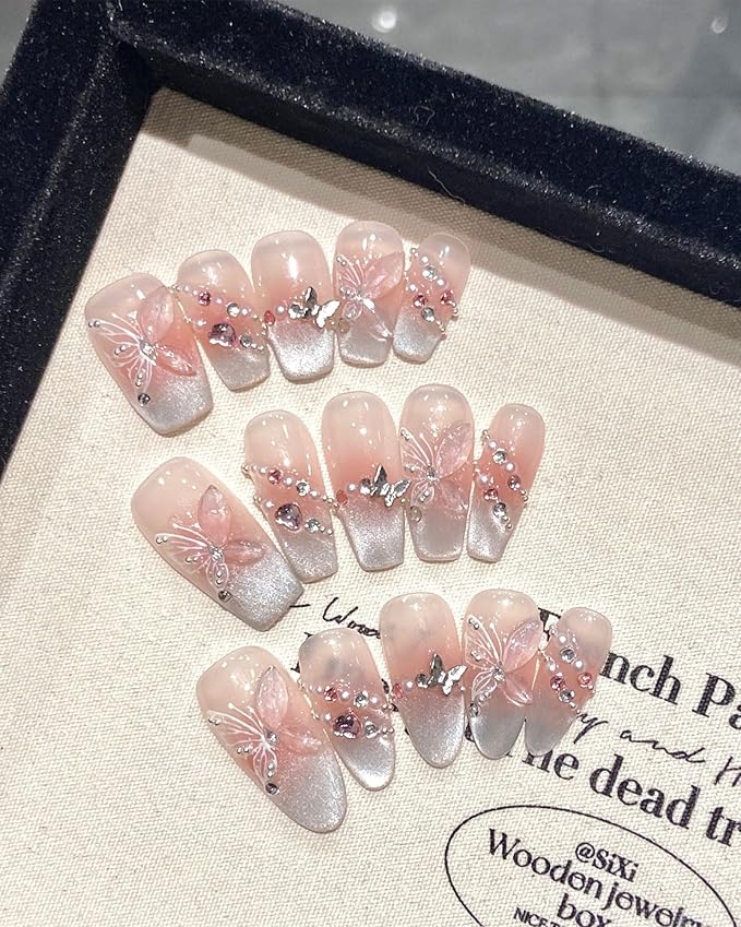 ネイルチップ ロング ピンク 手作り つけ爪 長め 可愛い 付け爪 シンプル 韓国 かわいい 人気 おしゃれ 光沢 立体 蝶 3D キラキラ 花嫁 結婚式 入学式 卒業式 成人式 (手作ネイル-2, S)