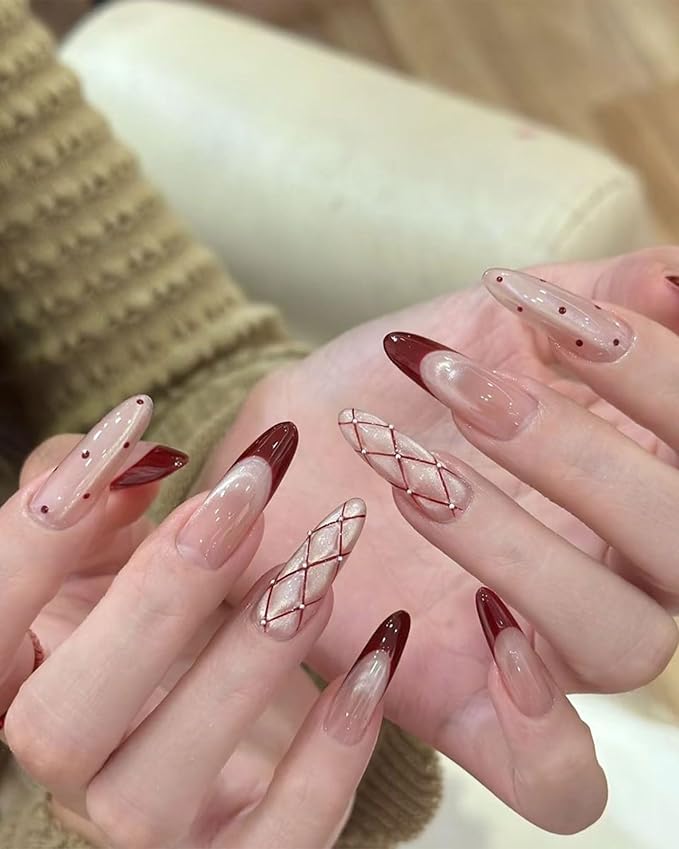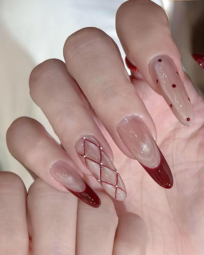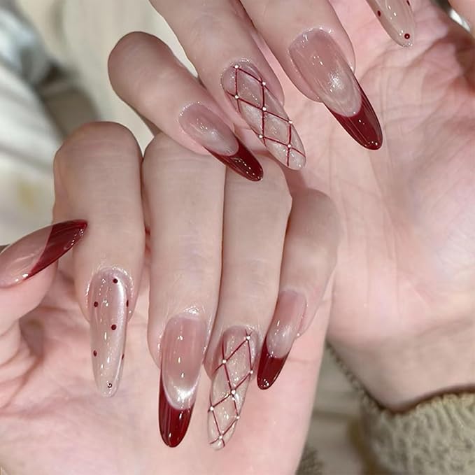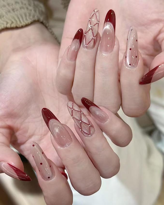 ネイルチップ 赤 ロング 24枚入 つけ爪 長め 付け爪 ワインレッド 可愛い 振袖 和風 つけづめ 秋冬 おしゃれ シンプル 人気 韓国 かわいい 繰り返し使える 花嫁 光沢 成人式 入学式 卒業式 結婚式 (長いタイプの赤色-20, M)