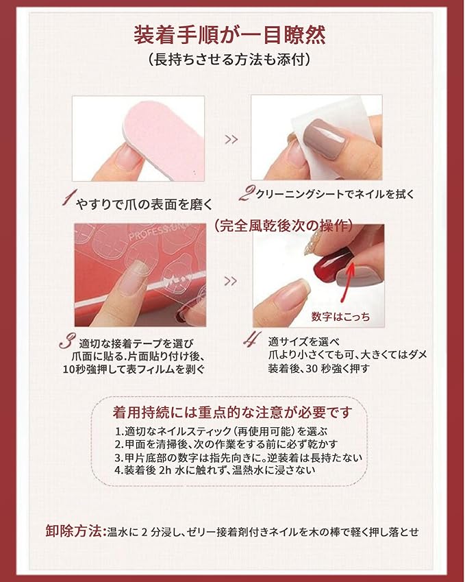 【初心者でも簡単に装着できる】専門的な技術がなくても、誰でも簡単に美しいネイルを作れます。爪表面を軽く整え、付属の両面テープでネイルチップを貼るだけ。初心者でも短時間でプロ並みの仕上がりを実現できます。