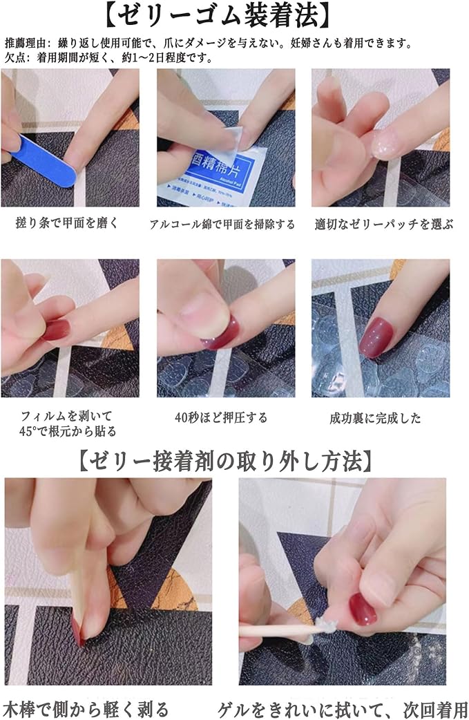 簡単で素早い取り付け方法:5〜10分で簡単に美しいネイルが完成!両面テープで素早く貼り付けられ、複雑な道具や技術は不要で、初心者や忙しいオフィスワーカーにも最適です。交換用テープも付属しており、繰り返し使用が可能です。
