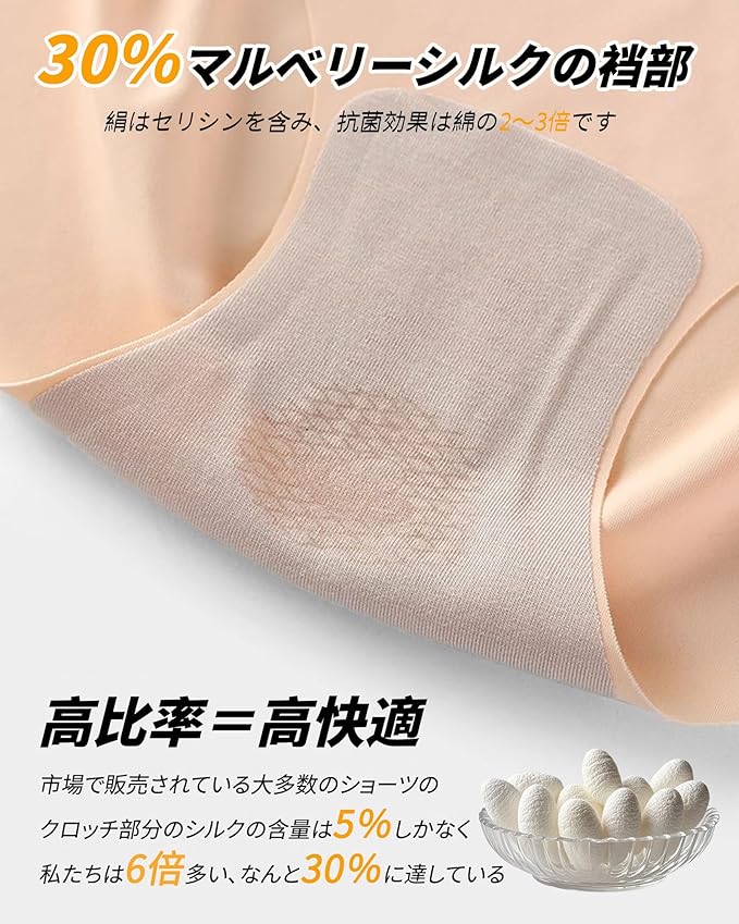 【30% マルベリーシルクのクロッチ部分】当社の製品はクロッチ部分にマルベリーシルク素材を厳選して使用しており、その含有率は驚くべき 30% に達します。マルベリーシルクパンツの抑菌原理は主に以下のいくつかの面に基づいています。マルベリーシルクは主にフィブロインとセリシンで構成されており、フィブロインは優れた生体適合性を持ち、セリシンは多種のアミノ酸を含んでおり、これらの成分はある種の細菌を抑える作用があります。同時に、マルベリーシルクは良好な通気性を持ち、湿度と温度を効果的に調節し、湿気と汗の蓄積を減らし、細菌の繁殖環境を低減します。マルベリーシルクの肌に優しい特性により、あなたは優しくケアされているような感覚を得られ、肌が快適と自在を満喫できます。
