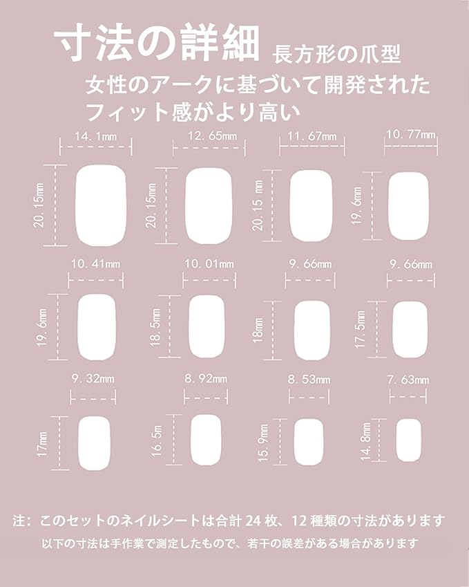 【豪華なセット内容で簡単に美しいネイルを実現】このネイルチップセットには、ネイルチップ24枚(12種類のサイズ)、付替え用両面テープ24枚、爪やすり1個、ウッドスティック1個が含まれています。自宅で簡単にプロフェッショナルなネイルアートを完成させることができ、わずか5分でサロンのような仕上がりを楽しめます。