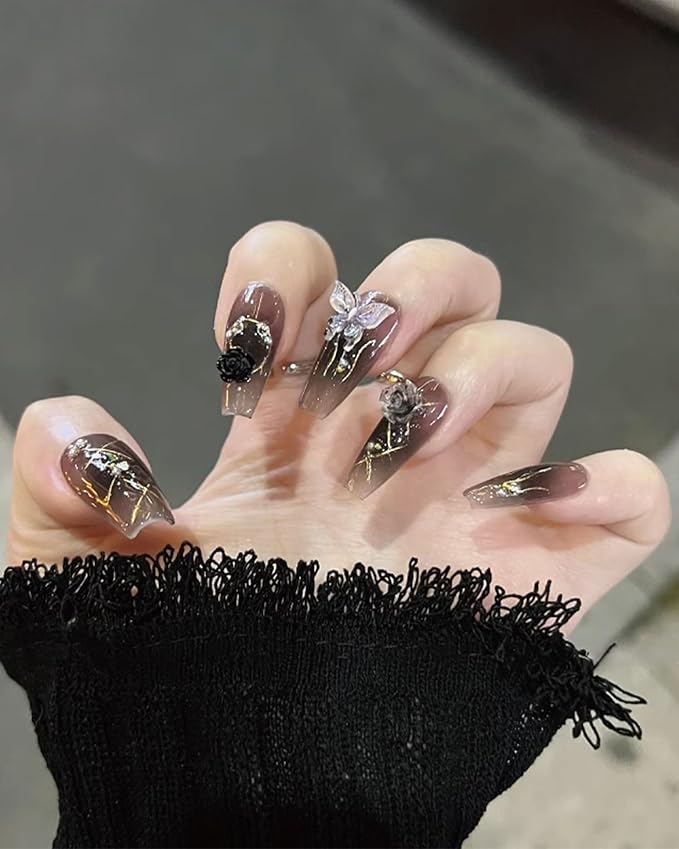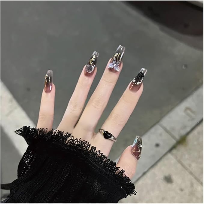 ネイルチップ ロング 黒 地雷系 かっこいい 手作り 付け爪 つけ爪 おしゃれ 人気 可愛い 長め 韓国 かわいい (手作ネイル-6, XS)