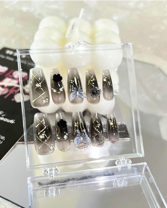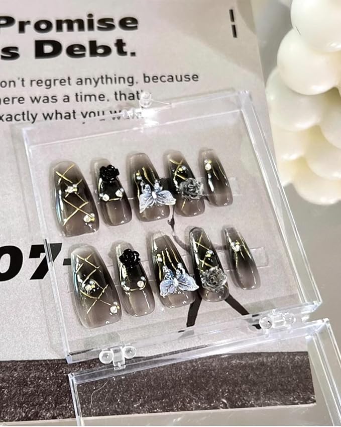 セット内容:本セットには、10枚の高品質なネイルチップ、交換用両面テープ、1本のネイルファイル、1本の木製スティックなどが含まれており、完全なケアと取り付けツールを提供します。専門のネイルサロンに行かなくても、自宅で簡単にプロフェッショナルなネイルを楽しめます。