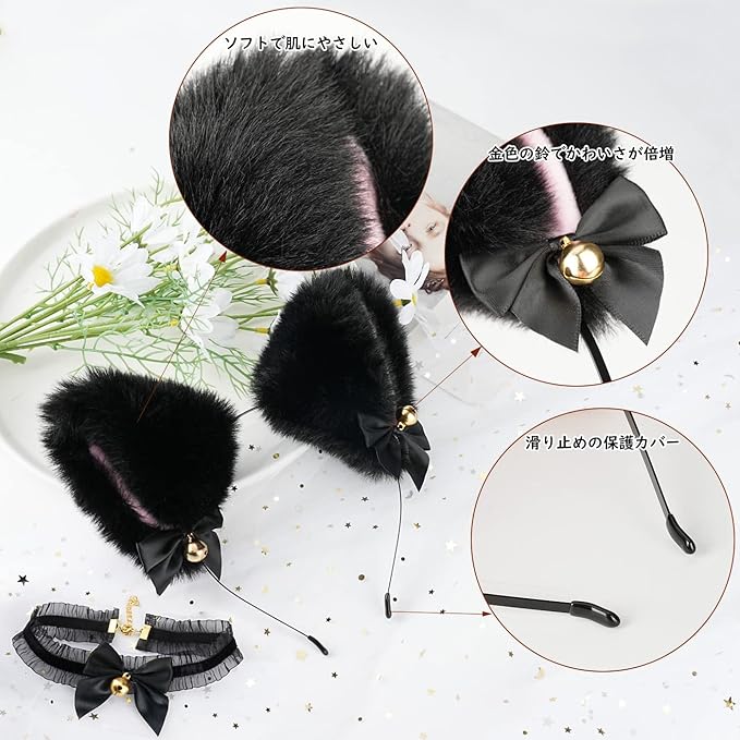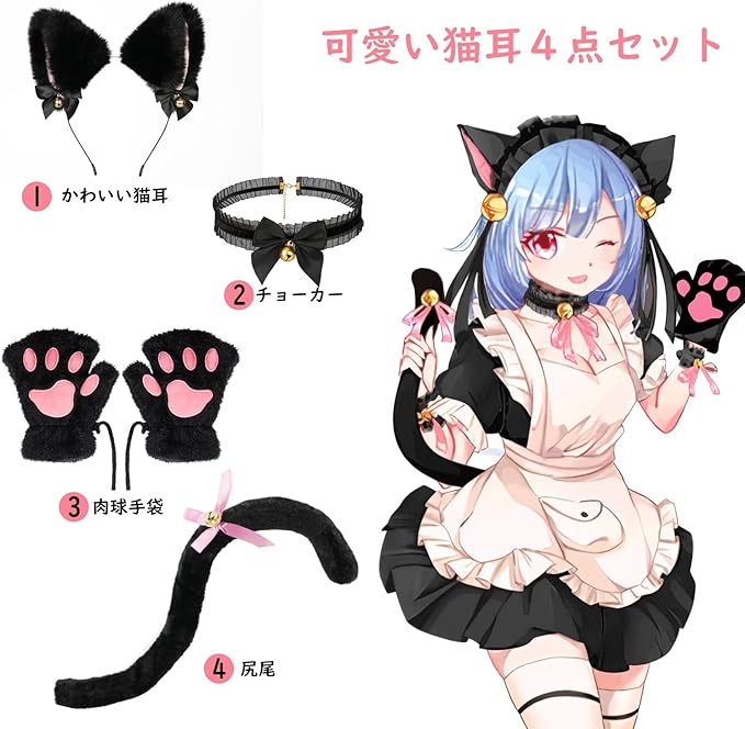 猫耳 カチューシャ 肉球手袋 尻尾 チョーカー 鈴付き やわらかい ハロウィン コスプレ 小物 4点セット (ブラック)