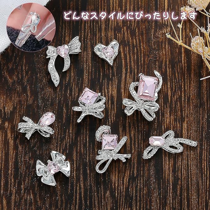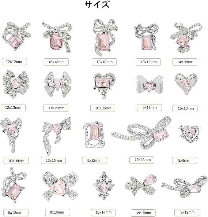 【商品情報】梱包内容:ネイルパーツ リボン20点入り。カラー:シルバー+ピンク。普段や結婚式などのパーティーに大活躍です