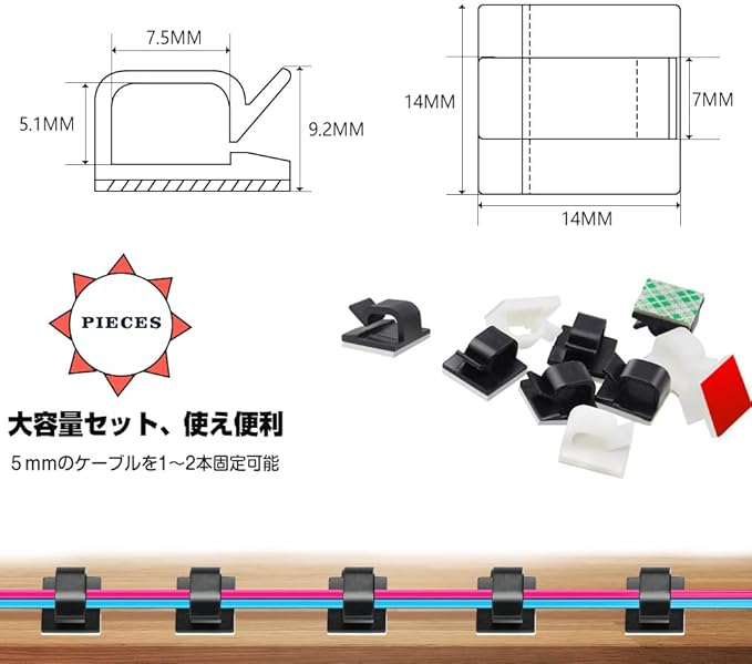 【セットの内容】ケーブルホルダー:20個、素材:PVC+両面テープ。サイズ:8.37mm*14.39mm*14mm。ご注意:粘着力が強いので、剥離紙がちょっと剥離しにくいです。ご了承ください