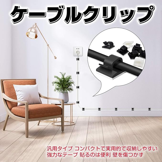 【使い方は簡単】固定したい場所に強力両面テープを剥がして貼り付け、ケーブルをクリップに挟むだけで配線が整理できます。釘は不要で、壁を傷つけません