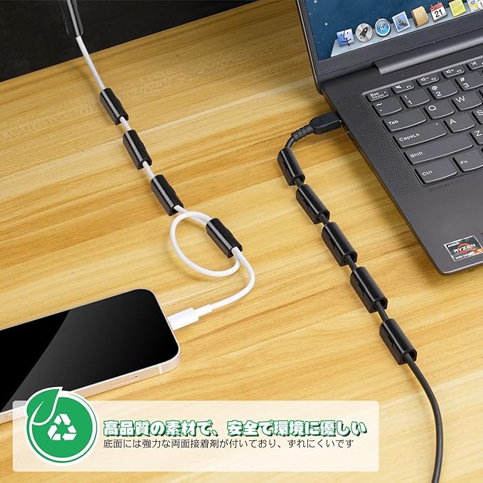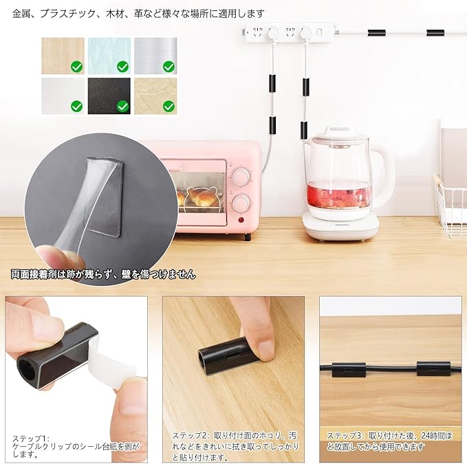 [強力な接着剤] 強粘着両面テープを採用し、複数のケーブルでもしっかり固定できます。ガラス、木材、プラスチック、金属などの様々な素材に対応し剥がれにくいので長期間の使用でも安心!