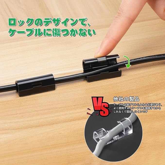 [使用簡単] まず、取り付け面のほこり、汚れをきれいに拭き取ります。そして、テープを1枚取って、ケーブルクリップの平滑面に貼り付けて、はくり紙をはがして必要の場所に貼り付けます。最後、ケーブルクリップ周りのケーブルをスッキリ収納し、ロックすると完成!