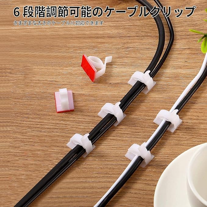【6階段調節可能】このケーブルクリップは6階段調節可能で、複数本のケーブルにも対応可能です。ごちゃごちゃしがちな電源コード、パソコン周りの配線などを簡単に整理できます。ご注意:8MMのケーブルを1本、5MMのケーブルを1-2本固定できます