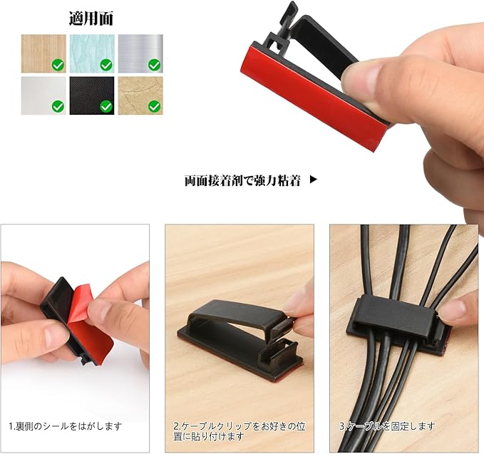 【使い簡単】両面テープのシールを剥がして、固定したい場所に貼り付け、ケーブルをクリップに挟むだけで完了です。釘は不要で、壁を傷つけません