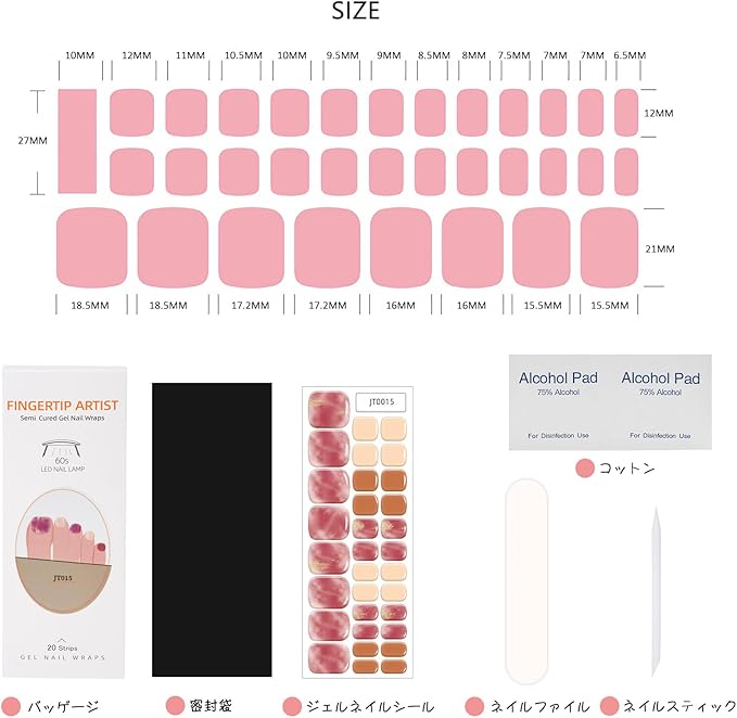 【ツール付き】セット内容:密封の足用ジェルネイルシール1シート32枚、爪やすり1枚、ネイルスティック1本、コットン2枚が入っており、ご自宅でのネイルアートをより便利になります