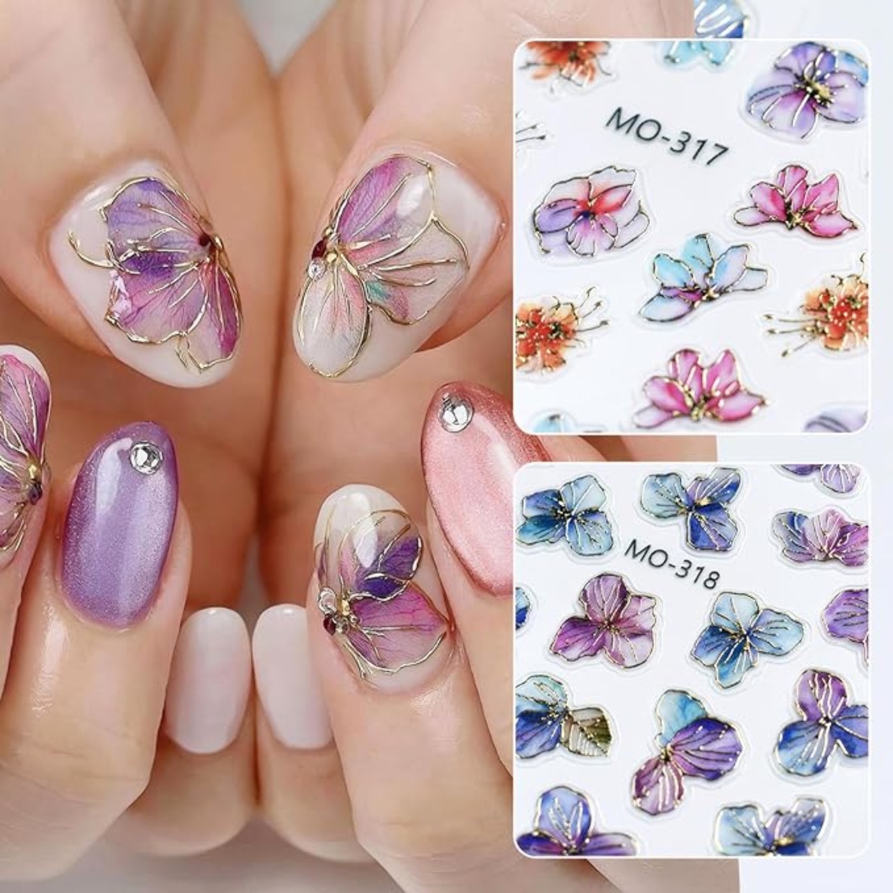 【カラフルなアジサイ】箔押しの紫陽花シール 2。印刷がはっきりしていて、貼るだけで指先を華やかにできます