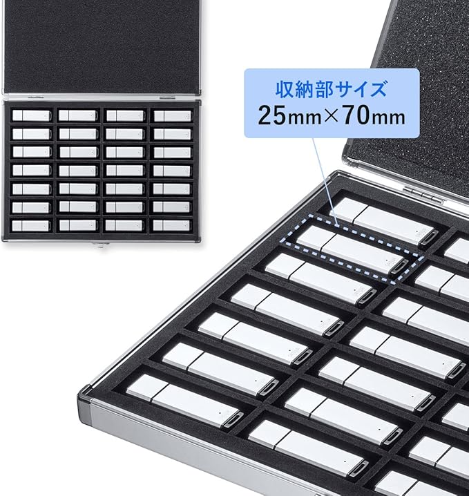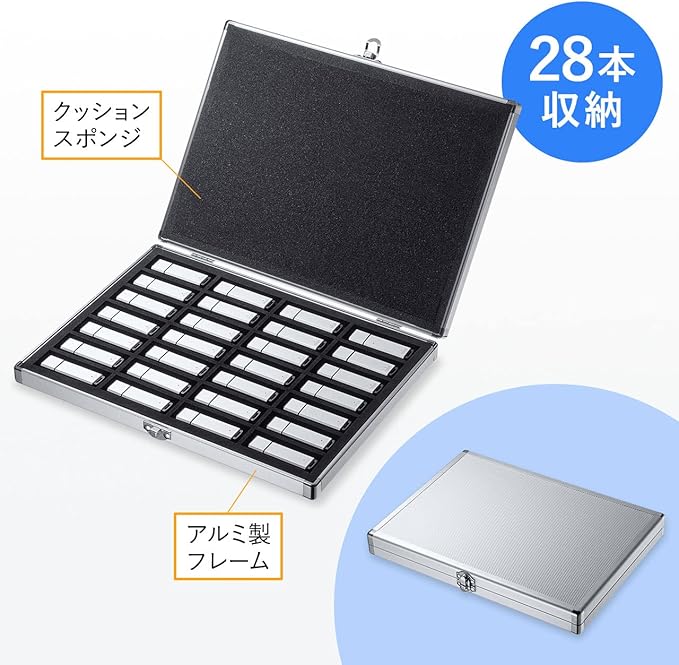 ●USBフラッシュメモリを28本収納できるアルミニウム製フレームを使ったUSBフラッシュメモリケースです。●頑丈なアルミニウム製フレーム採用によりUSBフラッシュメモリを強い衝撃から守ります。●様々な大きさのUSBフラッシュメモリに対応しています。●クッション性のあるスポンジで抑え込むような収納構造により、収納したUSBフラッシュメモリがケース内でカタカタ動きません。●一般的なA4ファイルと並べて棚に保管しやすいA4ファイルサイズです。■カラー:シルバー■サイズ:外寸/W319 D230 H37mm収納部内寸/W25 D70 H8mm※USB収納部の深さは約8mmですが蓋側のスポンジが沈み込む構造なので+2~3mm程度の厚みであれば収納可能です。■重量:約588g■材質:フレーム/アルミニウム、表面/ABS樹脂、内部/EVA■収容量:USBフラッシュメモリ 28本