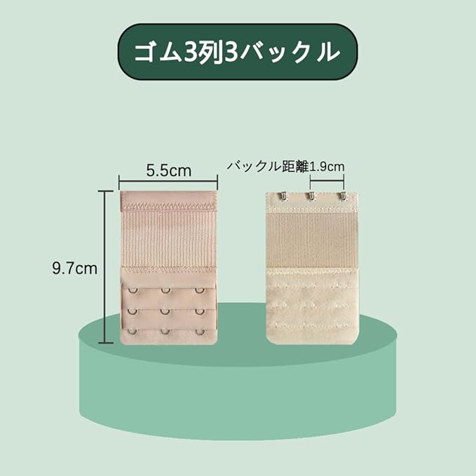 【製品サイズ】縦9.7cm 横5.5cm ホック間隔1.9cmカラー:肌色、黒、白、アプリコット 【製品素材】製品の材質はポリエステル+ステンレスです 弾力性、色落ちしにくいので、洗濯粉、石鹸、洗剤を使っても色落ちしません。 【耐久性】サビに強いステンレス製ホックを採用繰り返し使用に耐える構造 【主な用途】体型変化時のサイズ調整補助妊娠期/産後/授乳期等の体型変動に伴うサイズ調整をサポート体重増減によるブラジャーのフィット感改善に活用可能新しいブラジャーを買うより経済的です。 【使用が簡単】エクステンダーをブラジャーのフックとループに取り付け、現在使用しているブラジャーのフックをエクステンダーのフックとループに取り付けます。ブラジャーの長持ちできることによってお金を節約できます。