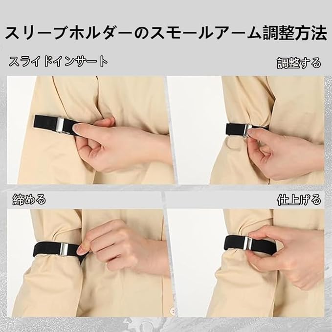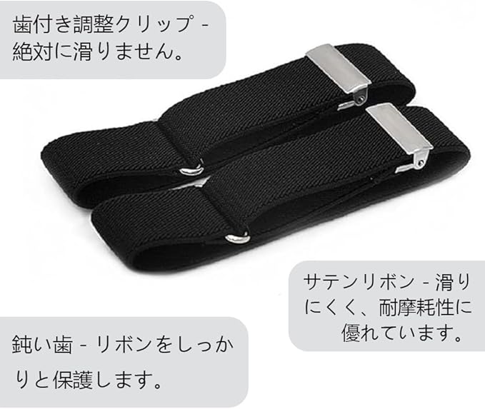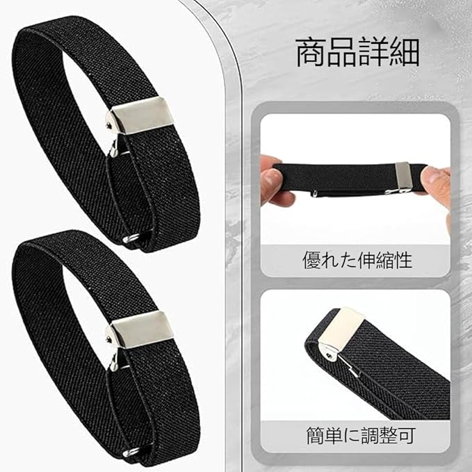 【製品仕様】アームバンド 2ペア 【 高品質の素材 】: 柔軟性と耐久性があり、丈夫で快適で、着用するとより紳士的に見えます。 【自由に調整可能】アジャスター付で腕の太さに合わせて細身の方から太目な方までご使用頂けます。フォーマルにビジネスに普段のお洒落のアクセントに丈の長いシャツの袖を調整するアームバンドです。 【着脱簡単】締め付け感が少なく伸びが良い、袖が長いワイシャツに簡単に対応、 素早く袖丈を調整します。腕に通すだけで、お好みの袖丈に簡単調節できます。 【 複数の用途 】: 教師、バーテンダー、ビジネスやレジャーの機会、事務員、ウェイターなどに最適で、仕事中にシャツの長袖を維持するのに役立ち、シャツの袖口をほこりや汚れから守ります。