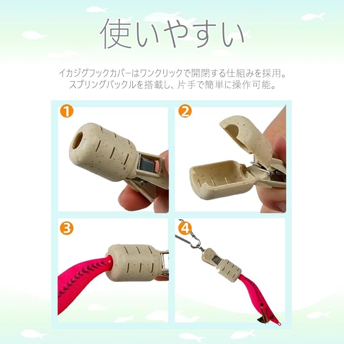 【使いやすい】イカジグフックカバーはワンクリックで開閉する仕組みを採用。スプリングバックルを搭載し、片手で簡単に操作可能。車で移動しながら釣りをする際、イカジグを付けたロッドをシートに置いても、フックがシートに刺さらず便利です。