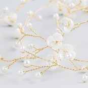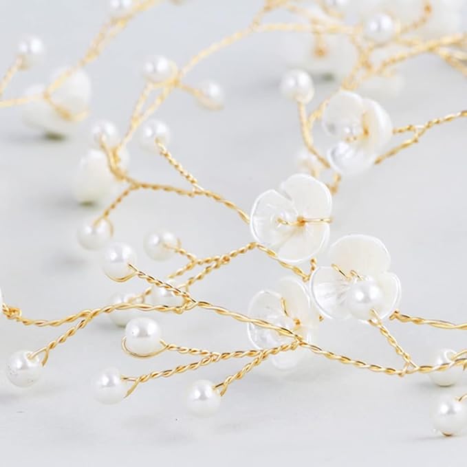 【華やかヘアアクセ】ゴールドワイヤーに白い花と真珠をあしらった上品なデザイン。髪を華やかに演出する結婚式向けアクセサリー
