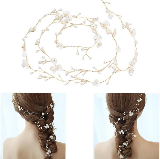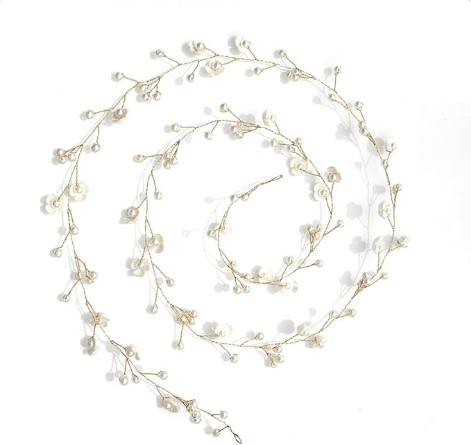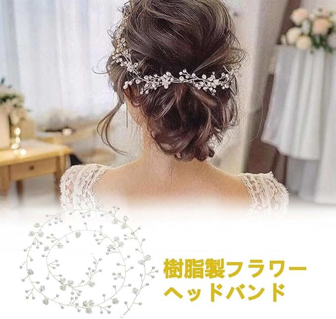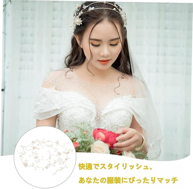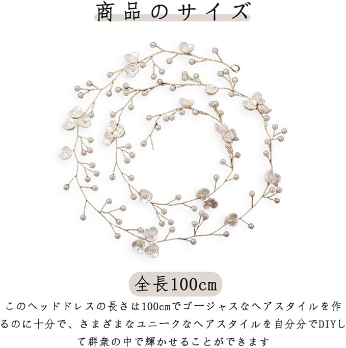 【華やかヘアアクセ】ゴールドワイヤーに白い花と真珠をあしらった上品なデザイン。髪を華やかに演出する結婚式向けアクセサリー 【サビに強い素材】軽くて曲げやすい合金ワイヤー+樹脂製の花。ドレスアップ時の使用に適した長持ちする作り 【100cmのたっぷり長さ】髪を束ねたり編んだり自由にアレンジ可能。和装にも洋装にも合わせやすい清楚なデザイン 【やさしいフィット感】手で曲げられるフレキシブルワイヤー。頭の形に合わせて自然になじむ柔らかさ 【特別な日のお供に】七五三・成人式・結婚式などフォーマルシーンで活躍。思い出の写真撮影にもおすすめ