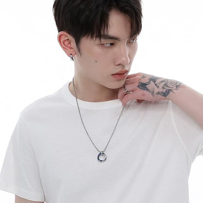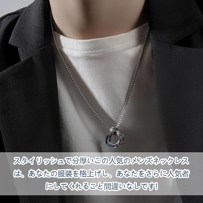 【上品なデザイン】 シンプルなデザインながらも上品な三連リングのネックレスです。さまざまなファッションに相性が良く、さりげないオシャレを演出します。 【材質】材質は高品質のチタン鋼です。 【耐久性】高品質のチタン鋼は、耐腐食性が高く、非常に硬い金属であるため、お手入れが簡単なアクセサリー素材です。ただし、アクセサリを長持ちさせるには定期的なメンテナンスが重要です。中性洗剤で洗い、清潔な布で水分を拭き取ってください。 【シンプルでオシャレなデザイン】ちょうど良い存在感が魅力のシンプルネックレスです。シンプルなデザインですが存在感があります。デザイン性をお求めの方に人気です。シンプルなツイストデザインを採用。スタイリッシュで分厚いこの人気のメンズネックレスは、あなたの服装を格上げし、あなたをさらに人気者にしてくれること間違いなしです! 【プレゼントに最適】本ネックレスはシンプルなデザインで、どなたにでも気に入っていただけるデザインです。プレゼントとしても喜ばれる一品です。父の日、バレンタインデー、誕生日、結婚式、友達 プレゼント、恋人 プレゼント、クリスマス、ホワイトデーなどのプレゼントに是非ご利用ください。
