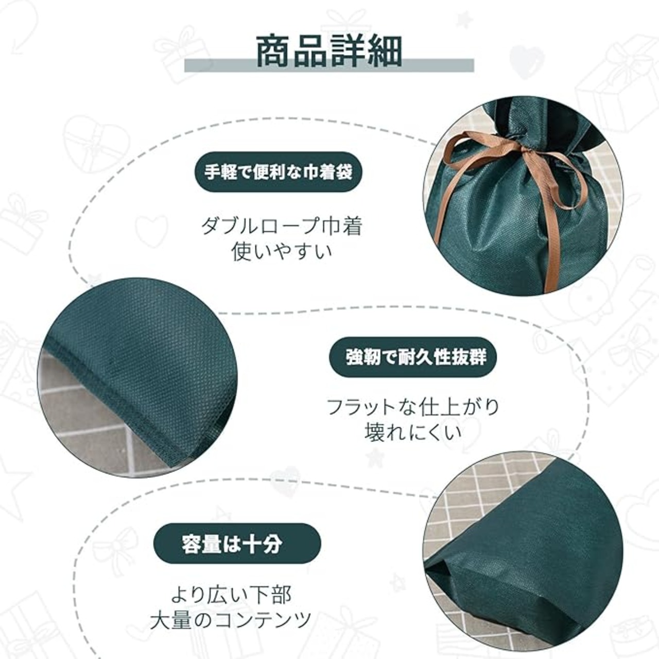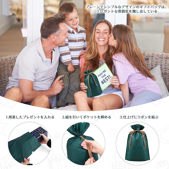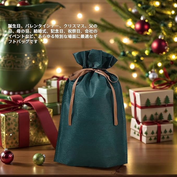 【環境に優しく持続可能な素材】当社のギフトバッグは、環境に優しい高品質な不織布を使用しています。耐久性が高く、繰り返し使用できるため、使い捨てプラスチック袋の使用を減らし、地球環境に配慮した選択が可能です。エコフレンドリーな素材で、贈り物にも責任を持てます。