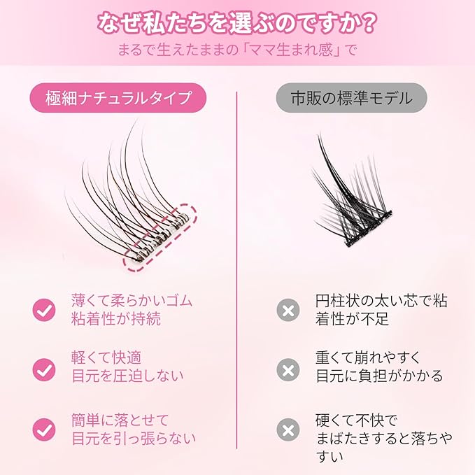 【軽量設計で一日中快適】一束わずか0.1gの超軽量設計。更轻盈! 装着時の重さや違和感を感じず、まるで何もつけていないかのような快適さを実現。透明のベースが目元に自然に融合します。