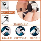 【特徴】このホイッスルのエッジにはスムースサンディングが施されています。 エッジが滑らかになり、マウスピースのバリが無くなるので、口が痛くなりません。 同時に、ホイッスルのマウスピースには凸状の溝があり、吹くときにホイッスルが落ちるのを防ぎます。 また、ホイッスルの先端にはテールホールがあり、紐に通して持ち運ぶことができます。
