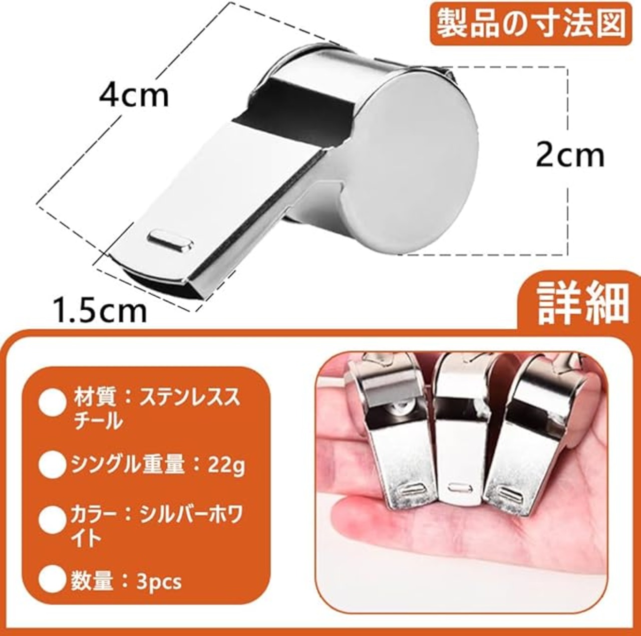 【商品サイズ】ホイッスルの長さは約4cm、高さは約2cm、幅は約1.5cm、総重量は約24g、個々のホイッスルは8g。ホイッスルの色はシルバーホワイト。