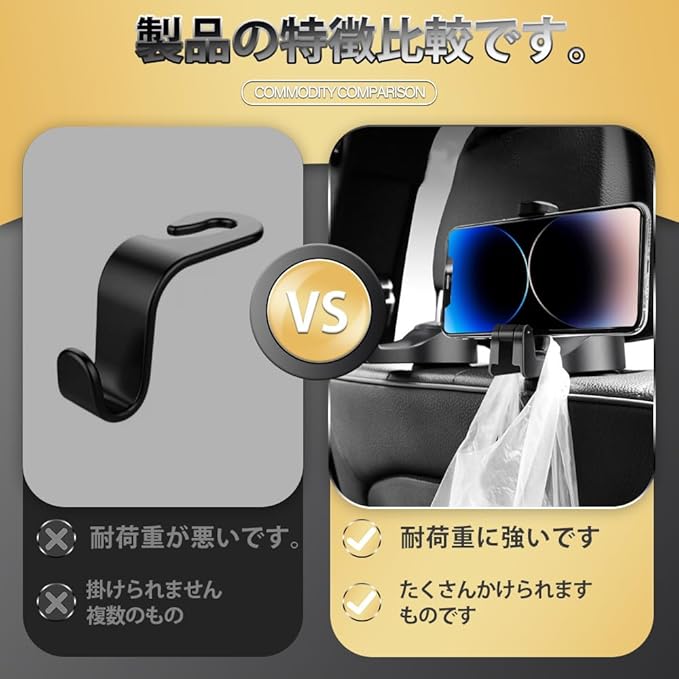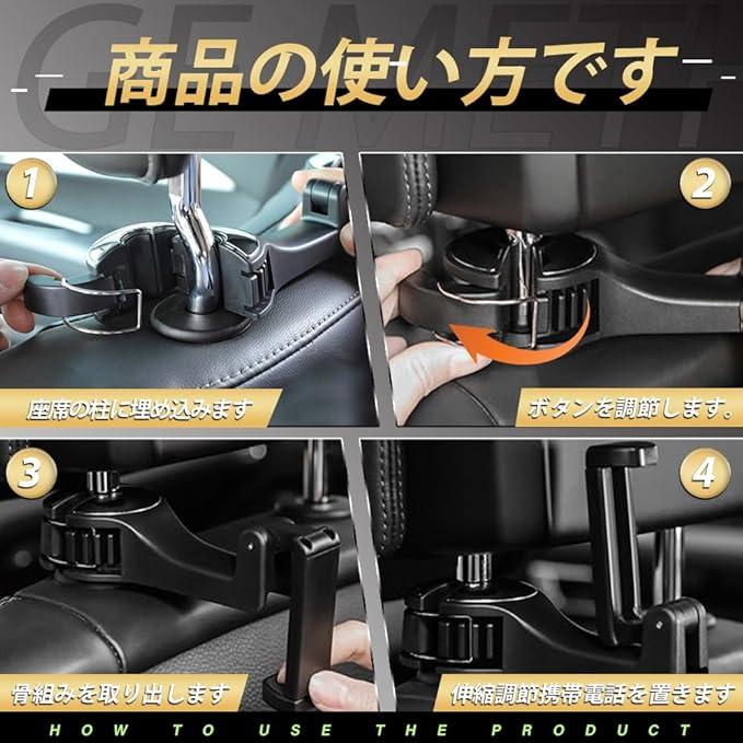 車用シートフック ヘッドレストフック 車用荷物フック 車用シート 車 フック ヘッドレスト フック 車用収納フック 収納フック隠し式 360度回転可能 ホルダー 荷物掛け 多機能 車のフック 簡単取付 耐荷重10kg 4-6.5インチのスマホに適用 2個セット (ブラック)