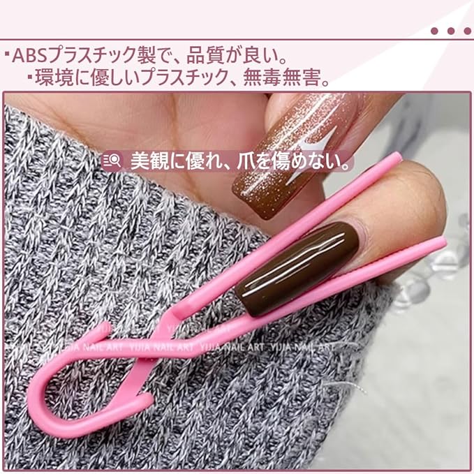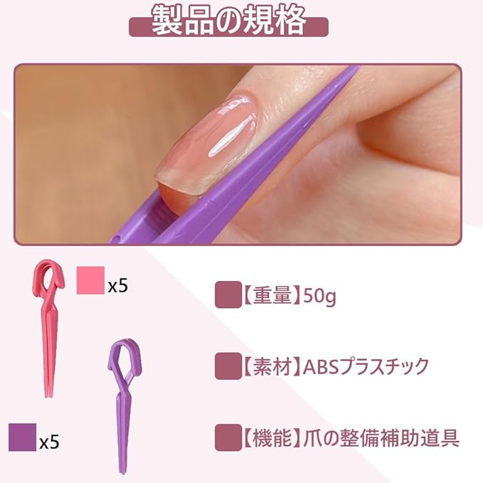 これは爪の整備補助道具としての天然爪クリップで、ABSプラスチック製で、ピンクとパープルの2色が各5個ずつ入り、計10個のセットです。 爪をしっかりと握り、ネイルアートやつめをととのえる際に便利なアイテムです。