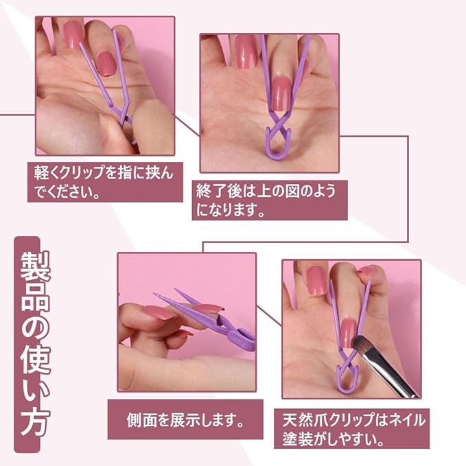 【使用方法】 軽くクリップを指に挟んで、爪を固定します。 使用後は、元の状態に戻します。 天然爪クリップはネイル塗装などの作業に便利です。