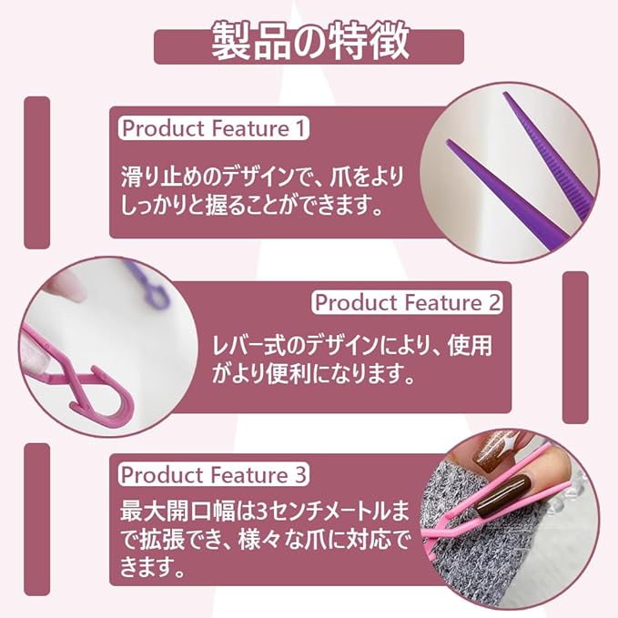 【製品の特徴】 滑り止めのデザインで、爪をしっかりと握ることができる。 レバー式のデザインにより、使用が便利になっている。 最大開口幅は3センチメートルまで拡張でき、様々な爪に対応できる。