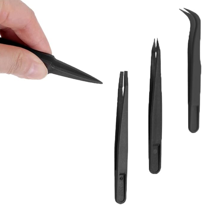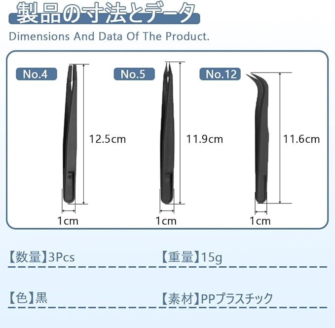 黒色の PP プラスチック製ピンセット 3 個セット(重量 15g)。3 種類(四角クリップ・尖った先のクリップ・弧状クリップ)のクリップで、DIY 制作(ハンドメイド小物)、宝石加工(宝石の組み立て・調整)、時計修理(機械部品の組み立て)など、細かい作業に最適。小物パーツ(針・宝石・髪の毛)をしっかり挟み、作業をスムーズにサポートするツールです。