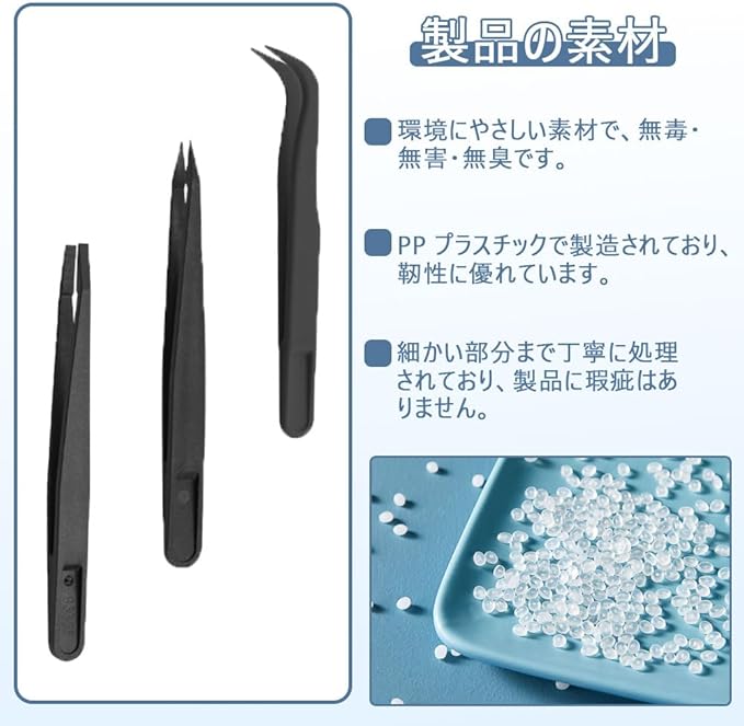 【製品の素材】 PP プラスチック製。環境にやさしく、無毒・無害・無臭。靭性に優れ、繰り返し使用しても変形せず。細かい部分まで丁寧に処理され、瑕疵のない高品質なピンセットです。