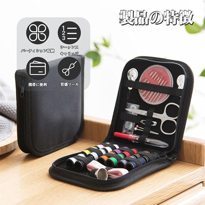 【裁縫セット内容】収納袋*1、縫い糸*14色(色はランダム)、裁縫針カバー*1(16本の裁縫針)、ピン*1、予備ボタン*3、真珠針*2、糸通し器*2、スケール*1、糸切り器*1、はさみ*1、トップ針*1の10種類の工具を収納し、ほとんどすべての裁縫作業を行うことができる。