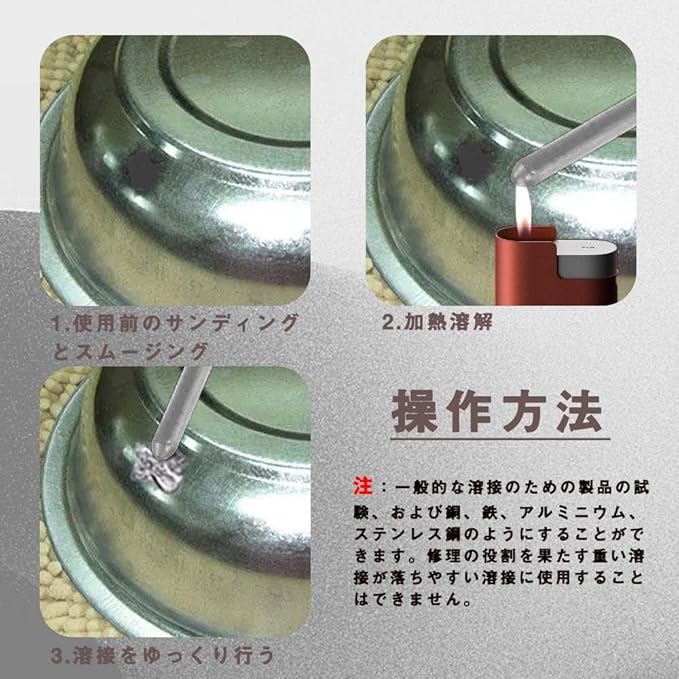 使用簡単:溶接棒は低温で動作するため、低熱が必要な溶接用途に最適です。普通のライターや小型溶接トーチでも使用でき、作業がより便利で安全です。低温溶接棒はさまざまな溶接プロジェクトに最適で。