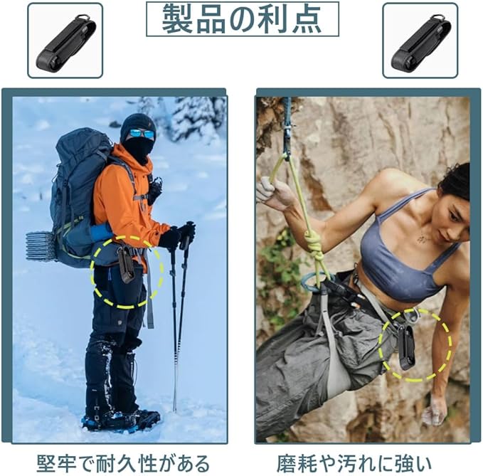 【製品の利点】 丈夫で耐久性があり、磨耗や汚れに強いです。 腰に取り付けることで、必要なツールがすぐに手に入り、アウトドア活動をスムーズにサポートします。