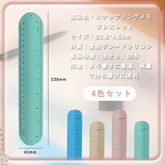 ウェアラブルメモ メモ帳 メモ帳 リストバンド 手首に巻く定規付き身につけるメモ 手首 メモ シリコンメモ 防水メモ ToDoリストノー 手首に巻くメモ 伝言メモ 腕バンドメモ やることリスト 書いて消せる 防水 ポケットサイズ 消せるメモ 腕に巻く 23.8*4.5cm 4色 4個入り