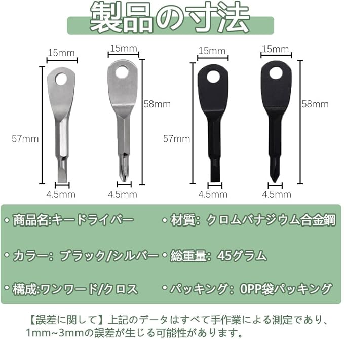 【商品サイズ】 マイナスドライバーの長さは57mm、幅は15mm、マイナスブレードの直径は4.5mmです。クロスヘッドねじ回しの長さは58mm、幅は15mm、クロスヘッドブレードの直径は4.5mmです。 全体の重量は45グラムで、持ち運びしやすいサイズです。