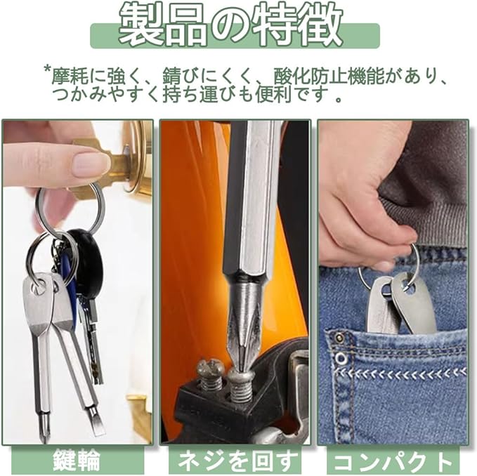 【商品紹介】 これは鍵型ドライバーセットで、クロスヘッドとスリットヘッドが各1本ずつ入っています。コンパクトなサイズで、キーホルダーにも使える便利なツールです。