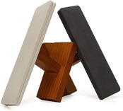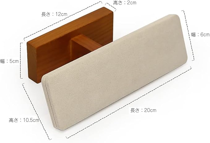 「サイズと素材」:幅20 奥行5 高さ10.5cm クッション部分:スエード 土台部分:天然木 温かみのあるデザインが腕時計の素材を引き立てます。