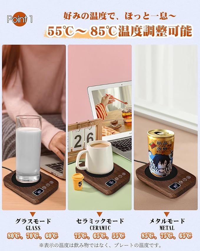 ☕【好みの温度で、ほっと一息】温度調整が1〜2段階しかない製品が多い中、こちらのコーヒーウォーマーは55℃~85℃の温度調節が可能です。カップの素材に合わせて、こまやかに加熱温度を設定できます。グラスモード(GLASS)は80℃、70℃、60℃調節出来ます。セラミックモード(CERAMIC)は75 ℃、65 ℃、55℃調節出来ます。メタルモード(METAL)は85 ℃、 75℃、65℃調節出来ます。仕事や家事、遊びで疲れた体や心を好みの温度で優しく“ホッ”と癒やします。