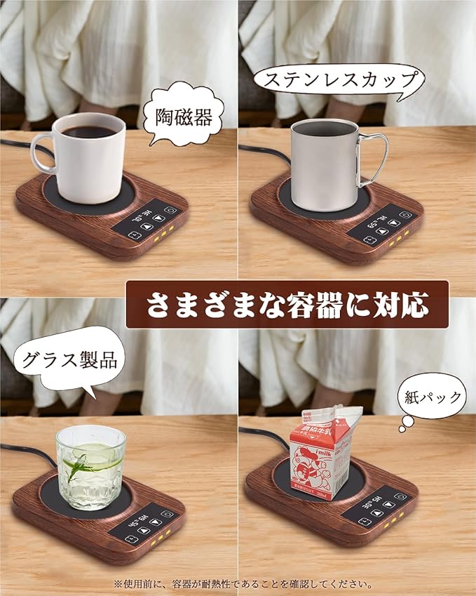 ☕【さまざまな容器に対応】さまざまなカップに対応している、使い勝手のよいカップウォーマーです。ガラス・陶器・ステンレス・金属缶・セラミックなどのカップをあたためられます。ドリンクを陶器のマグカップに移さなくても使えるためとても便利です。また、デザインもシンプルなので、自宅だけでなくオフィスで使うのもおすすめです。