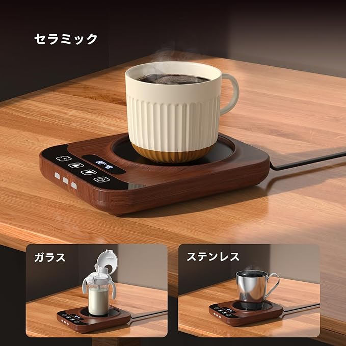 【9段階温度調節】こちらの商品は、9段階の温度設定が可能なカップウォーマーです。40℃から80℃までの範囲でお好みの温度を選べるため、飲み物を常に最適な温度に保つことができます。寒い季節や長時間の仕事中でも、最後まで暖かい飲み物を楽しめるのが特徴です。
